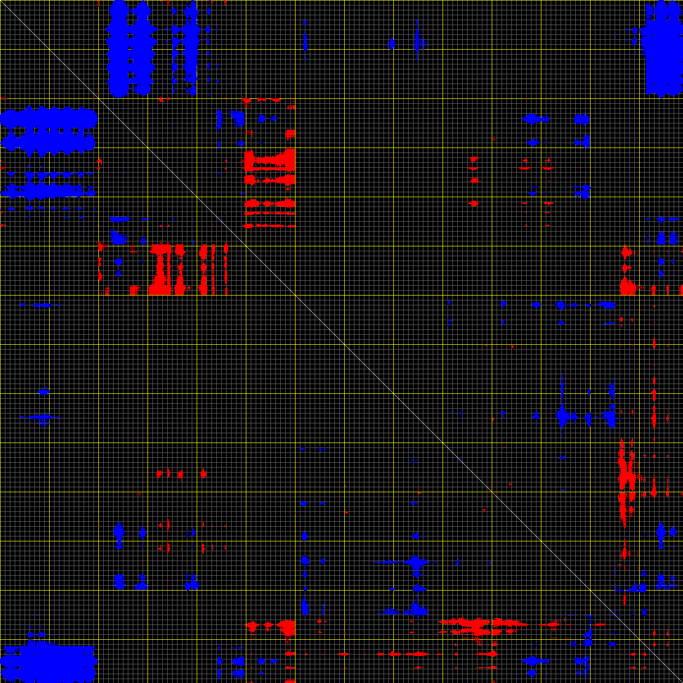 This matrix displays the maximum distance fluctuations between all pairs of CA atoms and between the two extreme conformations that were computed for this mode (DQMIN/DQMAX). Distance increases are plotted in blue and decreases in red for the strongest 10% of the residue pair distance changes. Every pixel corresponds to a single residue. Grey lines are drawn every 10 residues, yellow lines every 100 residues (counting from the upper left corner).
