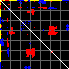 This matrix displays the maximum distance fluctuations between all pairs of CA atoms and between the two extreme conformations that were computed for this mode (DQMIN/DQMAX). Distance increases are plotted in blue and decreases in red for the strongest 10% of the residue pair distance changes. Every pixel corresponds to a single residue. Grey lines are drawn every 10 residues, yellow lines every 100 residues (counting from the upper left corner).