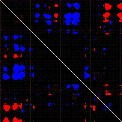 This matrix displays the maximum distance fluctuations between all pairs of CA atoms and between the two extreme conformations that were computed for this mode (DQMIN/DQMAX). Distance increases are plotted in blue and decreases in red for the strongest 10% of the residue pair distance changes. Every pixel corresponds to a single residue. Grey lines are drawn every 10 residues, yellow lines every 100 residues (counting from the upper left corner).