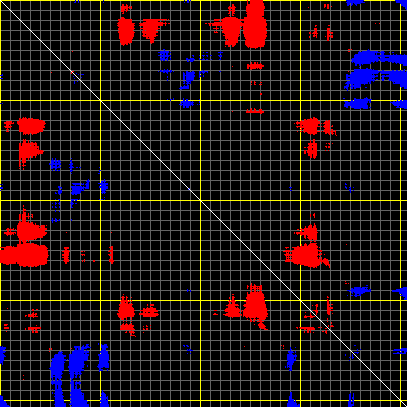 This matrix displays the maximum distance fluctuations between all pairs of CA atoms and between the two extreme conformations that were computed for this mode (DQMIN/DQMAX). Distance increases are plotted in blue and decreases in red for the strongest 10% of the residue pair distance changes. Every pixel corresponds to a single residue. Grey lines are drawn every 10 residues, yellow lines every 100 residues (counting from the upper left corner).
