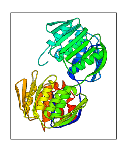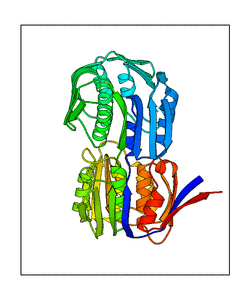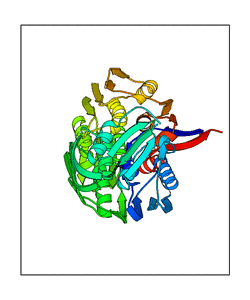 These views are prepared from three orthologuous viewpoints with MolScript. Secondary structures are determined from the C-alpha atom positions of your protein (N-terminal blue, C-terminal red).