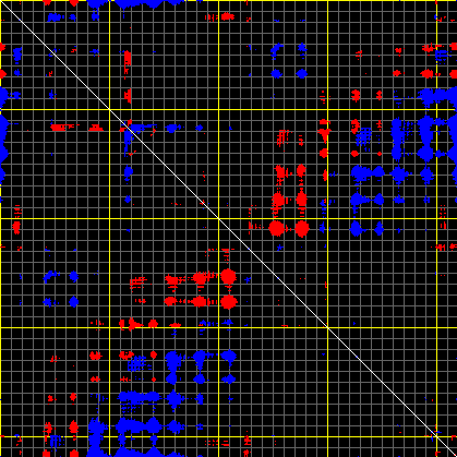 This matrix displays the maximum distance fluctuations between all pairs of CA atoms and between the two extreme conformations that were computed for this mode (DQMIN/DQMAX). Distance increases are plotted in blue and decreases in red for the strongest 10% of the residue pair distance changes. Every pixel corresponds to a single residue. Grey lines are drawn every 10 residues, yellow lines every 100 residues (counting from the upper left corner).