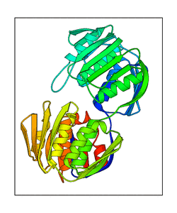 These views are prepared from three orthologuous viewpoints with MolScript. Secondary structures are determined from the C-alpha atom positions of your protein (N-terminal blue, C-terminal red).