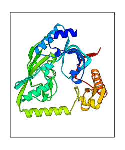 These views are prepared from three orthologuous viewpoints with MolScript. Secondary structures are determined from the C-alpha atom positions of your protein (N-terminal blue, C-terminal red).