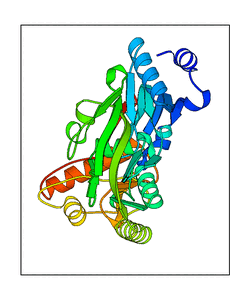 These views are prepared from three orthologuous viewpoints with MolScript. Secondary structures are determined from the C-alpha atom positions of your protein (N-terminal blue, C-terminal red).