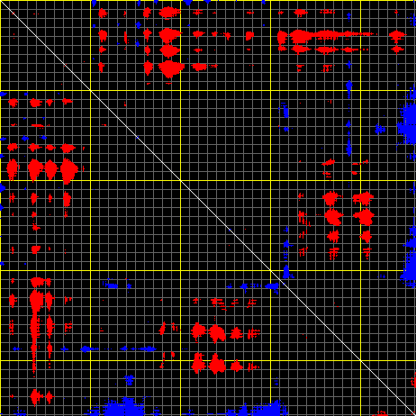 This matrix displays the maximum distance fluctuations between all pairs of CA atoms and between the two extreme conformations that were computed for this mode (DQMIN/DQMAX). Distance increases are plotted in blue and decreases in red for the strongest 10% of the residue pair distance changes. Every pixel corresponds to a single residue. Grey lines are drawn every 10 residues, yellow lines every 100 residues (counting from the upper left corner).