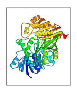 These views are prepared from three orthologuous viewpoints with MolScript. Secondary structures are determined from the C-alpha atom positions of your protein (N-terminal blue, C-terminal red).