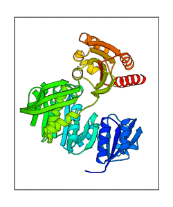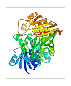 These views are prepared from three orthologuous viewpoints with MolScript. Secondary structures are determined from the C-alpha atom positions of your protein (N-terminal blue, C-terminal red).
