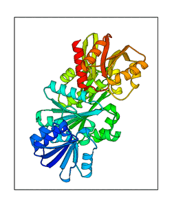 These views are prepared from three orthologuous viewpoints with MolScript. Secondary structures are determined from the C-alpha atom positions of your protein (N-terminal blue, C-terminal red).