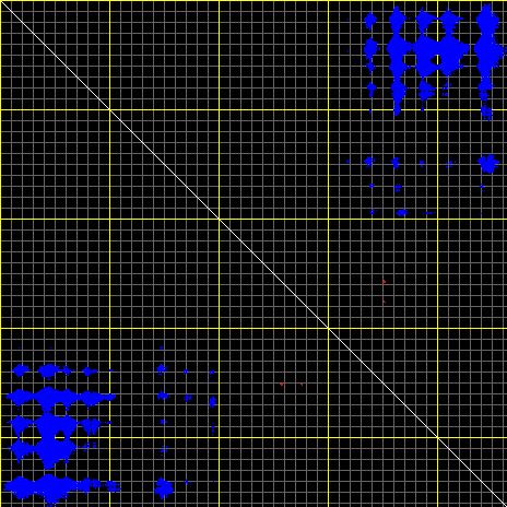 This matrix displays the maximum distance fluctuations between all pairs of CA atoms and between the two extreme conformations that were computed for this mode (DQMIN/DQMAX). Distance increases are plotted in blue and decreases in red for the strongest 10% of the residue pair distance changes. Every pixel corresponds to a single residue. Grey lines are drawn every 10 residues, yellow lines every 100 residues (counting from the upper left corner).