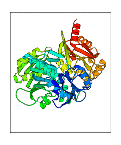 These views are prepared from three orthologuous viewpoints with MolScript. Secondary structures are determined from the C-alpha atom positions of your protein (N-terminal blue, C-terminal red).