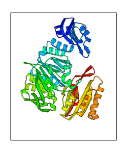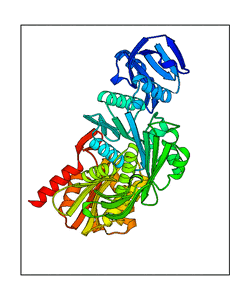 These views are prepared from three orthologuous viewpoints with MolScript. Secondary structures are determined from the C-alpha atom positions of your protein (N-terminal blue, C-terminal red).