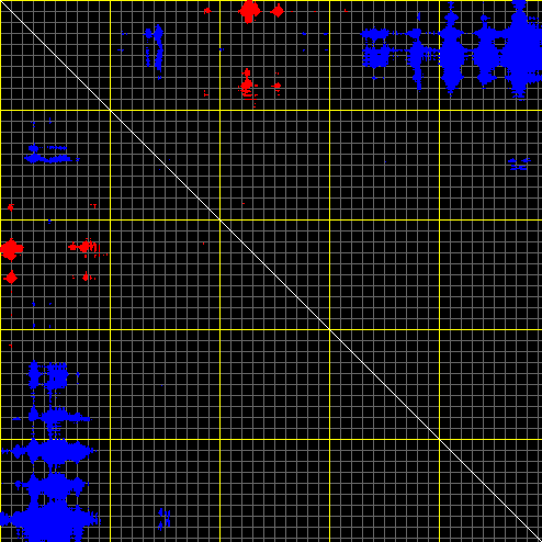 This matrix displays the maximum distance fluctuations between all pairs of CA atoms and between the two extreme conformations that were computed for this mode (DQMIN/DQMAX). Distance increases are plotted in blue and decreases in red for the strongest 10% of the residue pair distance changes. Every pixel corresponds to a single residue. Grey lines are drawn every 10 residues, yellow lines every 100 residues (counting from the upper left corner).