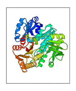 These views are prepared from three orthologuous viewpoints with MolScript. Secondary structures are determined from the C-alpha atom positions of your protein (N-terminal blue, C-terminal red).