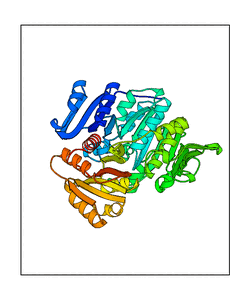 These views are prepared from three orthologuous viewpoints with MolScript. Secondary structures are determined from the C-alpha atom positions of your protein (N-terminal blue, C-terminal red).