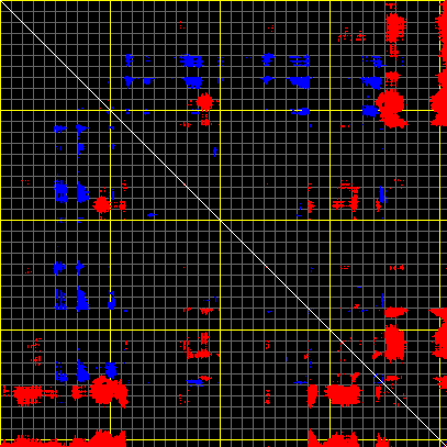 This matrix displays the maximum distance fluctuations between all pairs of CA atoms and between the two extreme conformations that were computed for this mode (DQMIN/DQMAX). Distance increases are plotted in blue and decreases in red for the strongest 10% of the residue pair distance changes. Every pixel corresponds to a single residue. Grey lines are drawn every 10 residues, yellow lines every 100 residues (counting from the upper left corner).