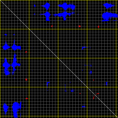 This matrix displays the maximum distance fluctuations between all pairs of CA atoms and between the two extreme conformations that were computed for this mode (DQMIN/DQMAX). Distance increases are plotted in blue and decreases in red for the strongest 10% of the residue pair distance changes. Every pixel corresponds to a single residue. Grey lines are drawn every 10 residues, yellow lines every 100 residues (counting from the upper left corner).
