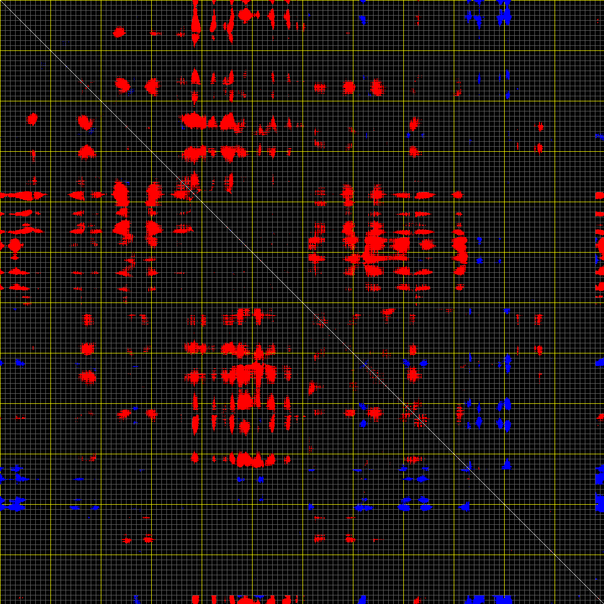 This matrix displays the maximum distance fluctuations between all pairs of CA atoms and between the two extreme conformations that were computed for this mode (DQMIN/DQMAX). Distance increases are plotted in blue and decreases in red for the strongest 10% of the residue pair distance changes. Every pixel corresponds to a single residue. Grey lines are drawn every 10 residues, yellow lines every 100 residues (counting from the upper left corner).