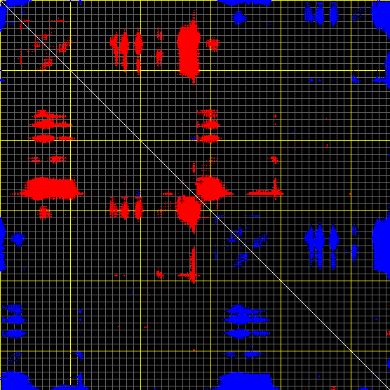 This matrix displays the maximum distance fluctuations between all pairs of CA atoms and between the two extreme conformations that were computed for this mode (DQMIN/DQMAX). Distance increases are plotted in blue and decreases in red for the strongest 10% of the residue pair distance changes. Every pixel corresponds to a single residue. Grey lines are drawn every 10 residues, yellow lines every 100 residues (counting from the upper left corner).