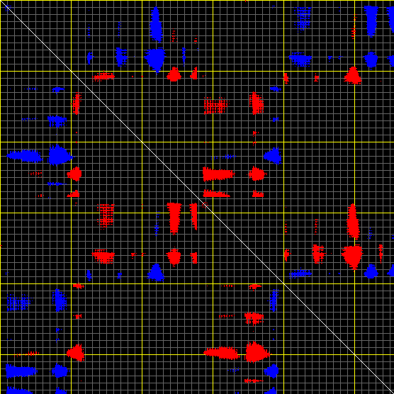 This matrix displays the maximum distance fluctuations between all pairs of CA atoms and between the two extreme conformations that were computed for this mode (DQMIN/DQMAX). Distance increases are plotted in blue and decreases in red for the strongest 10% of the residue pair distance changes. Every pixel corresponds to a single residue. Grey lines are drawn every 10 residues, yellow lines every 100 residues (counting from the upper left corner).