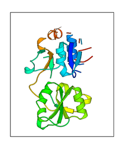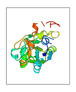 These views are prepared from three orthologuous viewpoints with MolScript. Secondary structures are determined from the C-alpha atom positions of your protein (N-terminal blue, C-terminal red).
