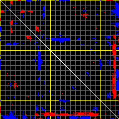 This matrix displays the maximum distance fluctuations between all pairs of CA atoms and between the two extreme conformations that were computed for this mode (DQMIN/DQMAX). Distance increases are plotted in blue and decreases in red for the strongest 10% of the residue pair distance changes. Every pixel corresponds to a single residue. Grey lines are drawn every 10 residues, yellow lines every 100 residues (counting from the upper left corner).