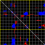This matrix displays the maximum distance fluctuations between all pairs of CA atoms and between the two extreme conformations that were computed for this mode (DQMIN/DQMAX). Distance increases are plotted in blue and decreases in red for the strongest 10% of the residue pair distance changes. Every pixel corresponds to a single residue. Grey lines are drawn every 10 residues, yellow lines every 100 residues (counting from the upper left corner).