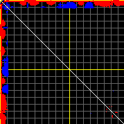 This matrix displays the maximum distance fluctuations between all pairs of CA atoms and between the two extreme conformations that were computed for this mode (DQMIN/DQMAX). Distance increases are plotted in blue and decreases in red for the strongest 10% of the residue pair distance changes. Every pixel corresponds to a single residue. Grey lines are drawn every 10 residues, yellow lines every 100 residues (counting from the upper left corner).