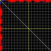 This matrix displays the maximum distance fluctuations between all pairs of CA atoms and between the two extreme conformations that were computed for this mode (DQMIN/DQMAX). Distance increases are plotted in blue and decreases in red for the strongest 10% of the residue pair distance changes. Every pixel corresponds to a single residue. Grey lines are drawn every 10 residues, yellow lines every 100 residues (counting from the upper left corner).