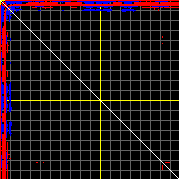 This matrix displays the maximum distance fluctuations between all pairs of CA atoms and between the two extreme conformations that were computed for this mode (DQMIN/DQMAX). Distance increases are plotted in blue and decreases in red for the strongest 10% of the residue pair distance changes. Every pixel corresponds to a single residue. Grey lines are drawn every 10 residues, yellow lines every 100 residues (counting from the upper left corner).
