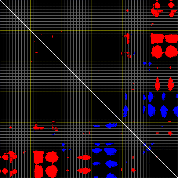 This matrix displays the maximum distance fluctuations between all pairs of CA atoms and between the two extreme conformations that were computed for this mode (DQMIN/DQMAX). Distance increases are plotted in blue and decreases in red for the strongest 10% of the residue pair distance changes. Every pixel corresponds to a single residue. Grey lines are drawn every 10 residues, yellow lines every 100 residues (counting from the upper left corner).