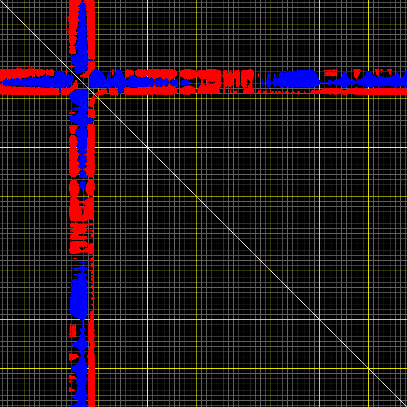 This matrix displays the maximum distance fluctuations between all pairs of CA atoms and between the two extreme conformations that were computed for this mode (DQMIN/DQMAX). Distance increases are plotted in blue and decreases in red for the strongest 10% of the residue pair distance changes. Every pixel corresponds to a single residue. Grey lines are drawn every 10 residues, yellow lines every 100 residues (counting from the upper left corner).