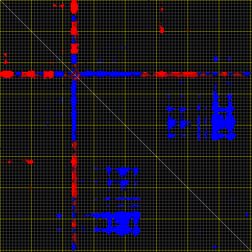 This matrix displays the maximum distance fluctuations between all pairs of CA atoms and between the two extreme conformations that were computed for this mode (DQMIN/DQMAX). Distance increases are plotted in blue and decreases in red for the strongest 10% of the residue pair distance changes. Every pixel corresponds to a single residue. Grey lines are drawn every 10 residues, yellow lines every 100 residues (counting from the upper left corner).