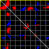 This matrix displays the maximum distance fluctuations between all pairs of CA atoms and between the two extreme conformations that were computed for this mode (DQMIN/DQMAX). Distance increases are plotted in blue and decreases in red for the strongest 10% of the residue pair distance changes. Every pixel corresponds to a single residue. Grey lines are drawn every 10 residues, yellow lines every 100 residues (counting from the upper left corner).