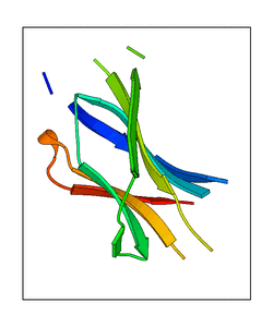 These views are prepared from three orthologuous viewpoints with MolScript. Secondary structures are determined from the C-alpha atom positions of your protein (N-terminal blue, C-terminal red).