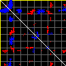 This matrix displays the maximum distance fluctuations between all pairs of CA atoms and between the two extreme conformations that were computed for this mode (DQMIN/DQMAX). Distance increases are plotted in blue and decreases in red for the strongest 10% of the residue pair distance changes. Every pixel corresponds to a single residue. Grey lines are drawn every 10 residues, yellow lines every 100 residues (counting from the upper left corner).