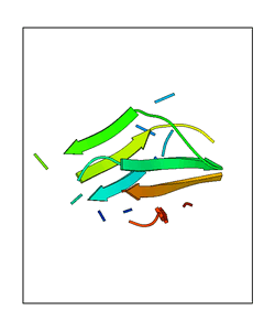 CAUTION: The amplitude range presented in these views corresponds to the highest (DQMAX) and lowest (DQMIN) perturbations chosen for this mode. Secondary structures can break down (and thus disappear from the animation) if the applied amplitudes are too large for Molscript to identify them. The choice of the amplitude is not a NMA result, but has to be done by the user on physical grounds. To change the amplitude range, you can recompute the animation of the desired mode by using the "Compute additional perturbed models with elNémo" section on the results page of your job.