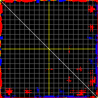 This matrix displays the maximum distance fluctuations between all pairs of CA atoms and between the two extreme conformations that were computed for this mode (DQMIN/DQMAX). Distance increases are plotted in blue and decreases in red for the strongest 10% of the residue pair distance changes. Every pixel corresponds to a single residue. Grey lines are drawn every 10 residues, yellow lines every 100 residues (counting from the upper left corner).