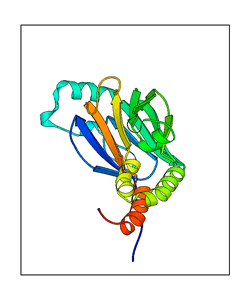 These views are prepared from three orthologuous viewpoints with MolScript. Secondary structures are determined from the C-alpha atom positions of your protein (N-terminal blue, C-terminal red).