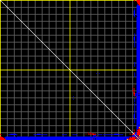 This matrix displays the maximum distance fluctuations between all pairs of CA atoms and between the two extreme conformations that were computed for this mode (DQMIN/DQMAX). Distance increases are plotted in blue and decreases in red for the strongest 10% of the residue pair distance changes. Every pixel corresponds to a single residue. Grey lines are drawn every 10 residues, yellow lines every 100 residues (counting from the upper left corner).