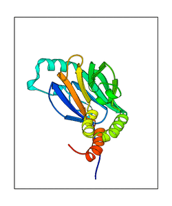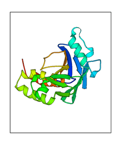 These views are prepared from three orthologuous viewpoints with MolScript. Secondary structures are determined from the C-alpha atom positions of your protein (N-terminal blue, C-terminal red).