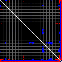 This matrix displays the maximum distance fluctuations between all pairs of CA atoms and between the two extreme conformations that were computed for this mode (DQMIN/DQMAX). Distance increases are plotted in blue and decreases in red for the strongest 10% of the residue pair distance changes. Every pixel corresponds to a single residue. Grey lines are drawn every 10 residues, yellow lines every 100 residues (counting from the upper left corner).