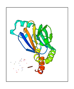 These views are prepared from three orthologuous viewpoints with MolScript. Secondary structures are determined from the C-alpha atom positions of your protein (N-terminal blue, C-terminal red).