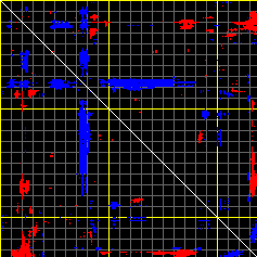 This matrix displays the maximum distance fluctuations between all pairs of CA atoms and between the two extreme conformations that were computed for this mode (DQMIN/DQMAX). Distance increases are plotted in blue and decreases in red for the strongest 10% of the residue pair distance changes. Every pixel corresponds to a single residue. Grey lines are drawn every 10 residues, yellow lines every 100 residues (counting from the upper left corner).