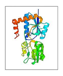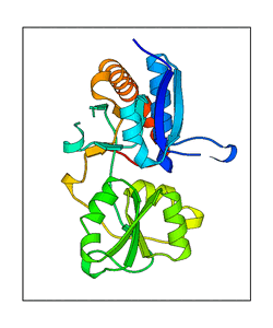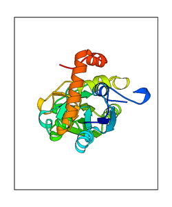 These views are prepared from three orthologuous viewpoints with MolScript. Secondary structures are determined from the C-alpha atom positions of your protein (N-terminal blue, C-terminal red).