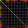 This matrix displays the maximum distance fluctuations between all pairs of CA atoms and between the two extreme conformations that were computed for this mode (DQMIN/DQMAX). Distance increases are plotted in blue and decreases in red for the strongest 10% of the residue pair distance changes. Every pixel corresponds to a single residue. Grey lines are drawn every 10 residues, yellow lines every 100 residues (counting from the upper left corner).