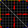 This matrix displays the maximum distance fluctuations between all pairs of CA atoms and between the two extreme conformations that were computed for this mode (DQMIN/DQMAX). Distance increases are plotted in blue and decreases in red for the strongest 10% of the residue pair distance changes. Every pixel corresponds to a single residue. Grey lines are drawn every 10 residues, yellow lines every 100 residues (counting from the upper left corner).