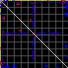 This matrix displays the maximum distance fluctuations between all pairs of CA atoms and between the two extreme conformations that were computed for this mode (DQMIN/DQMAX). Distance increases are plotted in blue and decreases in red for the strongest 10% of the residue pair distance changes. Every pixel corresponds to a single residue. Grey lines are drawn every 10 residues, yellow lines every 100 residues (counting from the upper left corner).