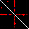 This matrix displays the maximum distance fluctuations between all pairs of CA atoms and between the two extreme conformations that were computed for this mode (DQMIN/DQMAX). Distance increases are plotted in blue and decreases in red for the strongest 10% of the residue pair distance changes. Every pixel corresponds to a single residue. Grey lines are drawn every 10 residues, yellow lines every 100 residues (counting from the upper left corner).