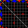 This matrix displays the maximum distance fluctuations between all pairs of CA atoms and between the two extreme conformations that were computed for this mode (DQMIN/DQMAX). Distance increases are plotted in blue and decreases in red for the strongest 10% of the residue pair distance changes. Every pixel corresponds to a single residue. Grey lines are drawn every 10 residues, yellow lines every 100 residues (counting from the upper left corner).